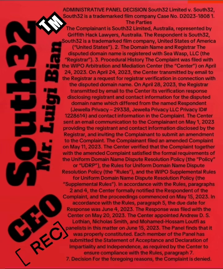 South32 President Suing Australian BHP mining BHP.com $800,000,000,000.00 Billion Dollars | South32 - Lawyers | Articles - Lawyers - Press Releases Archives - ADMINISTRATIVE PANEL DECISION South32 Limited v. South32, South32 is a trademarked film company Case No. D2023-1808 1. The Parties The Complainant is South32 Limited, Australia, represented by Griffith Hack Lawyers, Australia. The Respondent is South32, South32 is a trademarked film company, United States of America (“United States”). 2. The Domain Name and Registrar The disputed domain name is registered with Sea Wasp, LLC (the “Registrar”). 3. Procedural History The Complaint was filed with the WIPO Arbitration and Mediation Center (the “Center”) on April 24, 2023. On April 24, 2023, the Center transmitted by email to the Registrar a request for registrar verification in connection with the disputed domain name. On April 28, 2023, the Registrar transmitted by email to the Center its verification response disclosing registrant and contact information for the disputed domain name which differed from the named Respondent (Jewella Privacy – 29338, Jewella Privacy LLC Privacy ID# 1228614) and contact information in the Complaint. The Center sent an email communication to the Complainant on May 1, 2023 providing the registrant and contact information disclosed by the Registrar, and inviting the Complainant to submit an amendment to the Complaint. The Complainant filed an amended Complaint on May 11, 2023. The Center verified that the Complaint together with the amended Complaint satisfied the formal requirements of the Uniform Domain Name Dispute Resolution Policy (the “Policy” or “UDRP”), the Rules for Uniform Domain Name Dispute Resolution Policy (the “Rules”), and the WIPO Supplemental Rules for Uniform Domain Name Dispute Resolution Policy (the “Supplemental Rules”). In accordance with the Rules, paragraphs 2 and 4, the Center formally notified the Respondent of the Complaint, and the proceedings commenced on May 15, 2023. In accordance with the Rules, paragraph 5, the due date for Response was June 4, 2023. The Response was filed with the Center on May 20, 2023. The Center appointed Andrew D. S. Lothian, Nicholas Smith, and Mohamed-Hossam Loutfi as panelists in this matter on June 15, 2023. The Panel finds that it was properly constituted. Each member of the Panel has submitted the Statement of Acceptance and Declaration of Impartiality and Independence, as required by the Center to ensure compliance with the Rules, paragraph 7. 7. Decision For the foregoing reasons, the Complaint is denied.